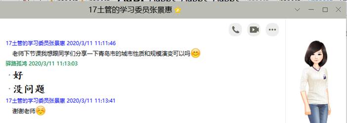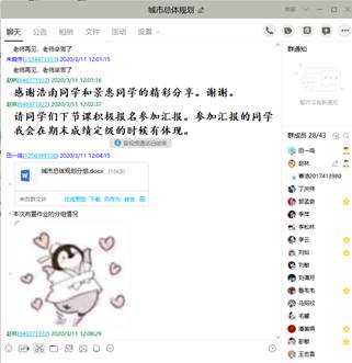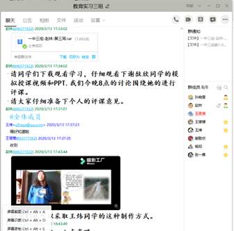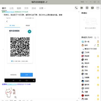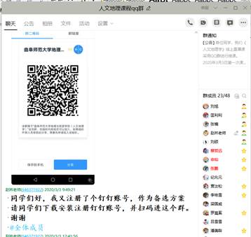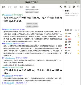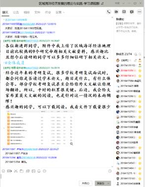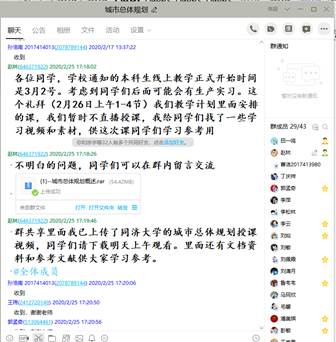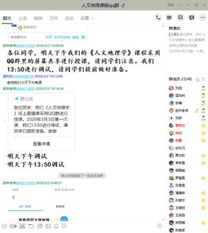 安排的“网络直播+线上互动答疑+慕课辅导”为主的线上教学组织方式,考虑到不同线上直播平台的性能差异,先后安装了雨课堂、钉钉群、QQ群,并将本学期每门课程选课同学建立了课程群。由于寒假期间我举行过线上研究生组会,感觉QQ群的屏幕共享功能顺畅性、交流性更强,因此,最终选取了QQ群为主,雨课堂和钉钉群为备选的线上直播方案。同时,QQ群中同学们进行线上互动和线下交流也非常方便,我也可以随时随地的回复同学们的问题。此外,之前下载的文献、慕课视频也每次课结束后或授课前进行群共享,便于同学们下载学习。