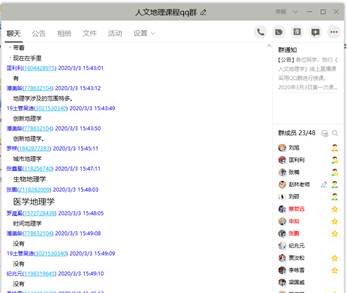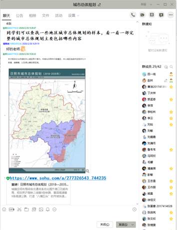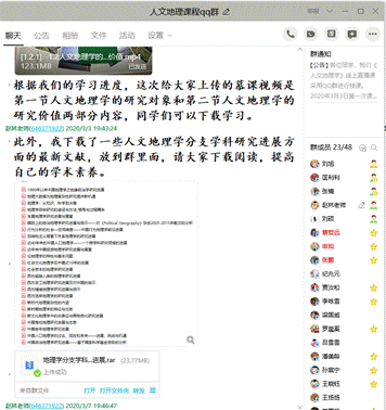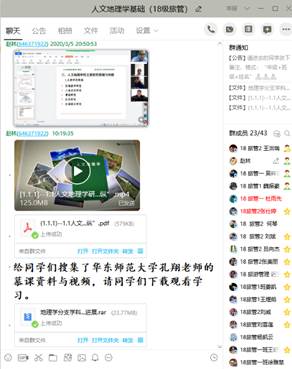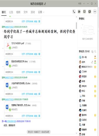 考虑到部分同学居家学习,可能不具备教材或者其他专业学习资料较少等问题。一方面,我下载了由华东师范大学孔翔团队主讲的《人文地理学》和同济大学彭震伟教授主讲的《城市总体规划》慕课视频,根据进度近期上传到QQ群,供同学们观看视频学习。另一方面,我下载了大量的与专业相关的科技文献,压缩共享到QQ群,同学们可以下载阅读,拓展知识面,了解本专业前沿。比如《人文地理学》和《人文地理学基础》课程方面下载了人文地理学及其主要分支学科的研究进展文献;《区域海洋经济发展的理论与实践》研讨课给同学们提供了区域海洋经济主要分支方向的最新文献等。此外,考虑到《城市总体规划》课程的实践性较强,我将多个城市的规划文本、规划图件也在QQ群中进行了共享,让同学们对城市总体规划的规划成果形成感性认识。