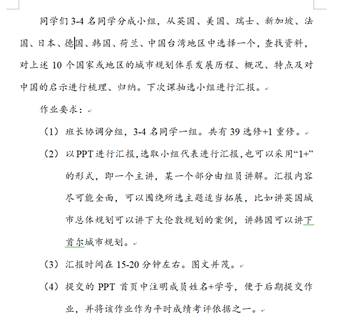 线上直播授课的方式,如果由教师对着电脑屏幕,以PPT和其他教学素材单纯进行直播授课,学生只负责记录笔记进行互动,这种传统的“满堂灌”效果并不会太好,不便于发挥学生的主动性和积极性,为此,我尝试以小组合作完成作业,进行作业共享的方式,变“教师主动教,学生被动学”为“教师只点评,学生主动学”。我主讲的《城市总体规划》课中,会给学生布置进行课堂展示的作业,学生以小组为单位,搜集资料制作PPT,课堂上进行分享。学生的主动性和积极性被激发出来,并且,通过搜集整理资料,学生自主学习能力和总结归纳能力得到了极大锻炼。一些学生甚至提前预约,想将自己的PPT给同学们进行分享。