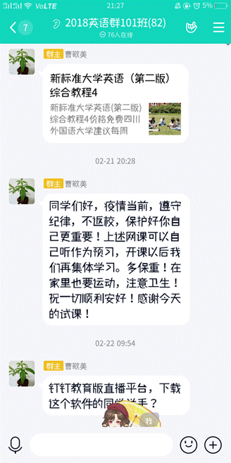 老师们虽然不能像在课堂上一样时时看着我们,但是要求却一点没有放松呢,那认真负责的态度也表现淋漓尽致,及时为同学们解答学习上遇到的问题。比如:有一次上中国自然地理在弹幕上说的一个问题,孙老师下课之后看到了,特意给我打来了语音电话解答我的疑惑,我真的是被老师细致的态度打动。为了减少网上授课存在的弊端,更好的了解到同学们对当前所讲内容的掌握程度,老师与同学们连麦,及时得到同学们反馈的信息,以便更好地进行讲授。老师们会根据每节课所学知识布置适量的作业供同学们完成,会为同学们分享各种便捷的学习资料,学习视频,学习网站,让同学们充分的利用网络的优势,扩充自己的知识储备。虽然在家,但是一点也不影响学习,而且还可以借这个机会锻炼自己的自学能力。