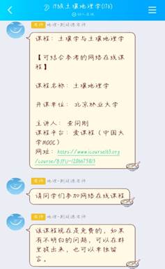 同时,为了让我们在没有课本的情况下能更好地把握课程整体框架、更加明晰学习方向,在正式网课之前,老师们为我们精心挑选推荐了中国MOOC的一些课程,如气候学与气象学廉老师推荐的走进大气科学与大气物理学,土壤地理学荆老师推荐的土壤学与土壤地理学。同时,提前上传课程课件,给我们留足预习时间,为网课正式开始做最充分的准备。至此,万事俱备只欠东风。