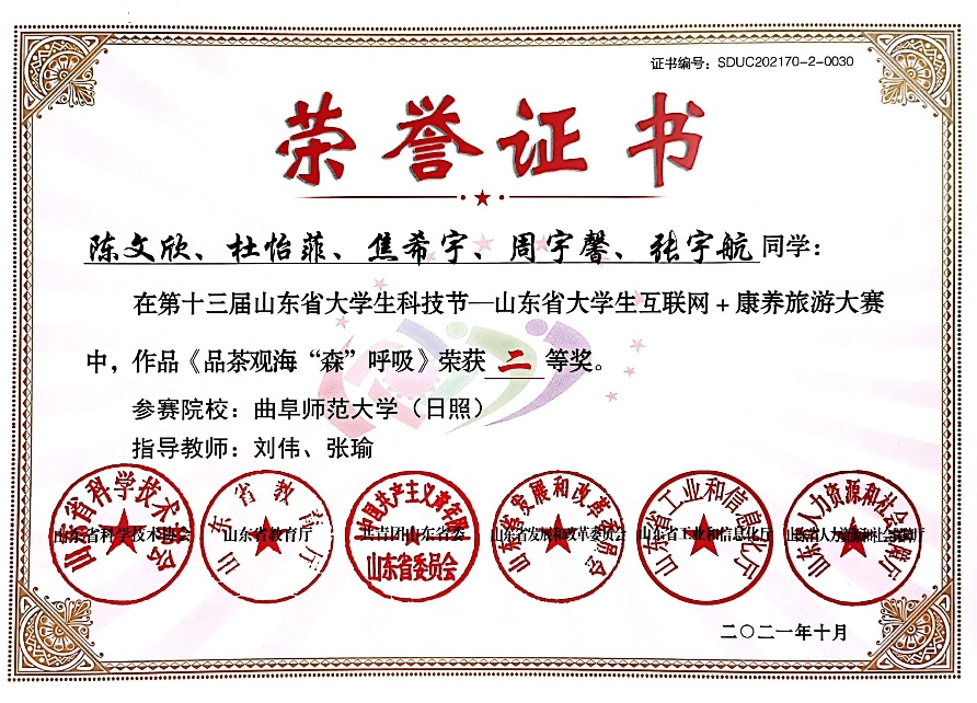 周宇馨组成的《品茶观海“森”呼吸》项目团队,在指导老师刘伟、张瑜指导下斩获省级二等奖。