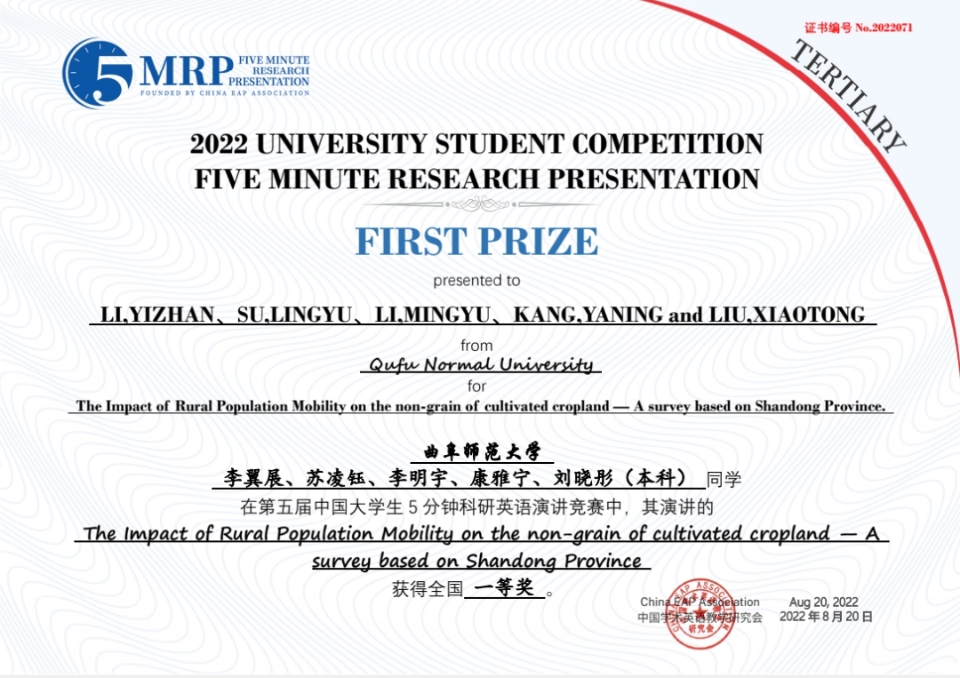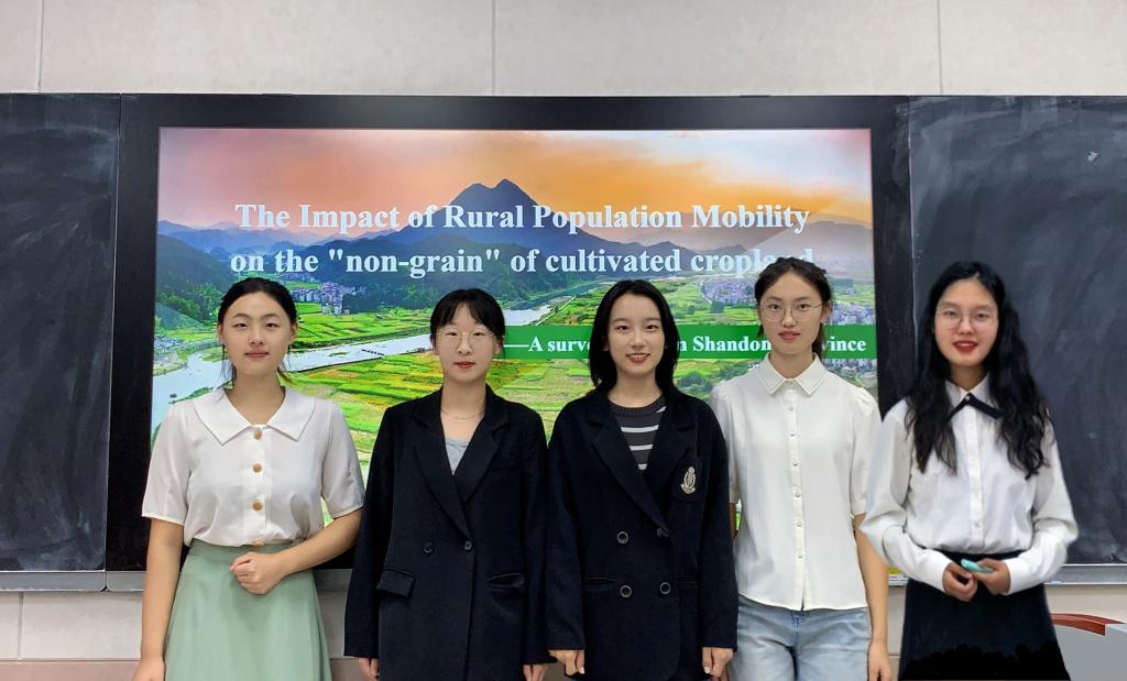 参赛的获奖作品“The Impact of Rural Population Mobility on the Non-grain of Cultivated Cropland——A survey based on Shandong Province”(乡村人口流动对耕地非粮化的影响——基于山东省的调查),在孙丕苓副教授指导下,基于2021-2022学年寒假社会实践收集的山东省7个地市174份农户调查数据,综合运用参与式农村评估法、空间自相关分析、地理探测器、格兰杰因果检验等方法,揭示农户视角下乡村人口流失、耕地“非粮化”的影响因素、发生机制以及乡村人口流失对耕地“非粮化”的影响,并从多角度尝试提出解决问题的对策与建议。