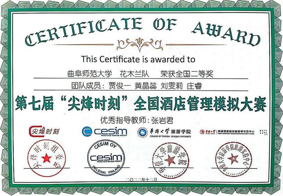 2022年12月,第七届“尖烽时刻”全国酒店管理模拟大赛总决赛圆满落幕,在张岩君老师指导下,2021级旅游管理专业本科生贾俊一、黄晶蕊、庄睿和2022级MTA研究生刘雯莉组成的参赛队伍——“花木兰队”,历时近两个月,在518支参赛队伍中披荆斩棘,最终挺进总决赛,并获得全国二等奖的好成绩。