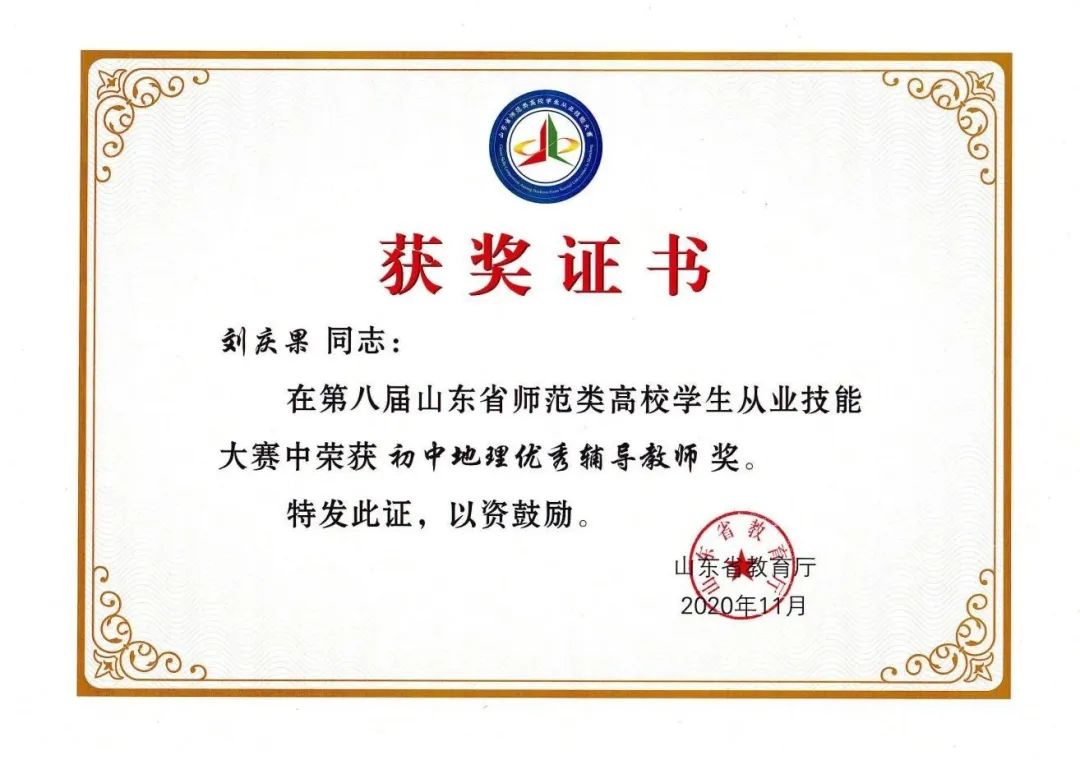 自2019年以来,连续4年指导山东省师范类高校学生从业技能大赛、山东省大学生科技节——山东地理教学技能大赛等赛事。三次(第八届、第九届、第十一届)获得山东省师范类高校学生从业技能大赛优秀辅导教师,指导学生获得山东省师范类高校学生从业技能大赛一等奖3次,其中2021年指导的程蓉同学获第九届山东省师范类高校学生从业技能大赛高中地理推荐组一等奖第一名;连续四次(第十一届、第十二届、第十三届、第十四届)获得山东省大学生科技节-山东地理教学技能大赛优秀指导教师;参与指导学生获得“田家炳杯”全日制教育硕士专业学位研究生学科教学(地理)教学技能大赛二等奖1次、三等奖1次。