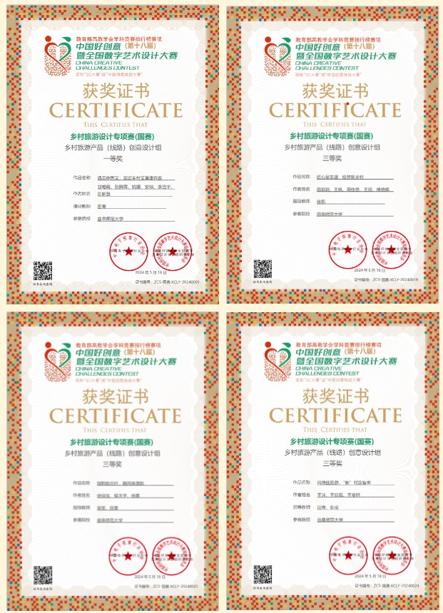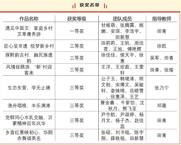 我校是大赛乡村旅游产品(路线)创意设计组获奖最多的院校。其中,甘唯萌、张腾霄、姚娜、安琪、李浩宇等同学的作品《遇见中国艾:家庭乡村艾草康养游》在田青老师指导下,以乡村旅游产品(路线)创意设计组第一名的优异成绩获一等奖,现场向各地高校的参赛选手展示。