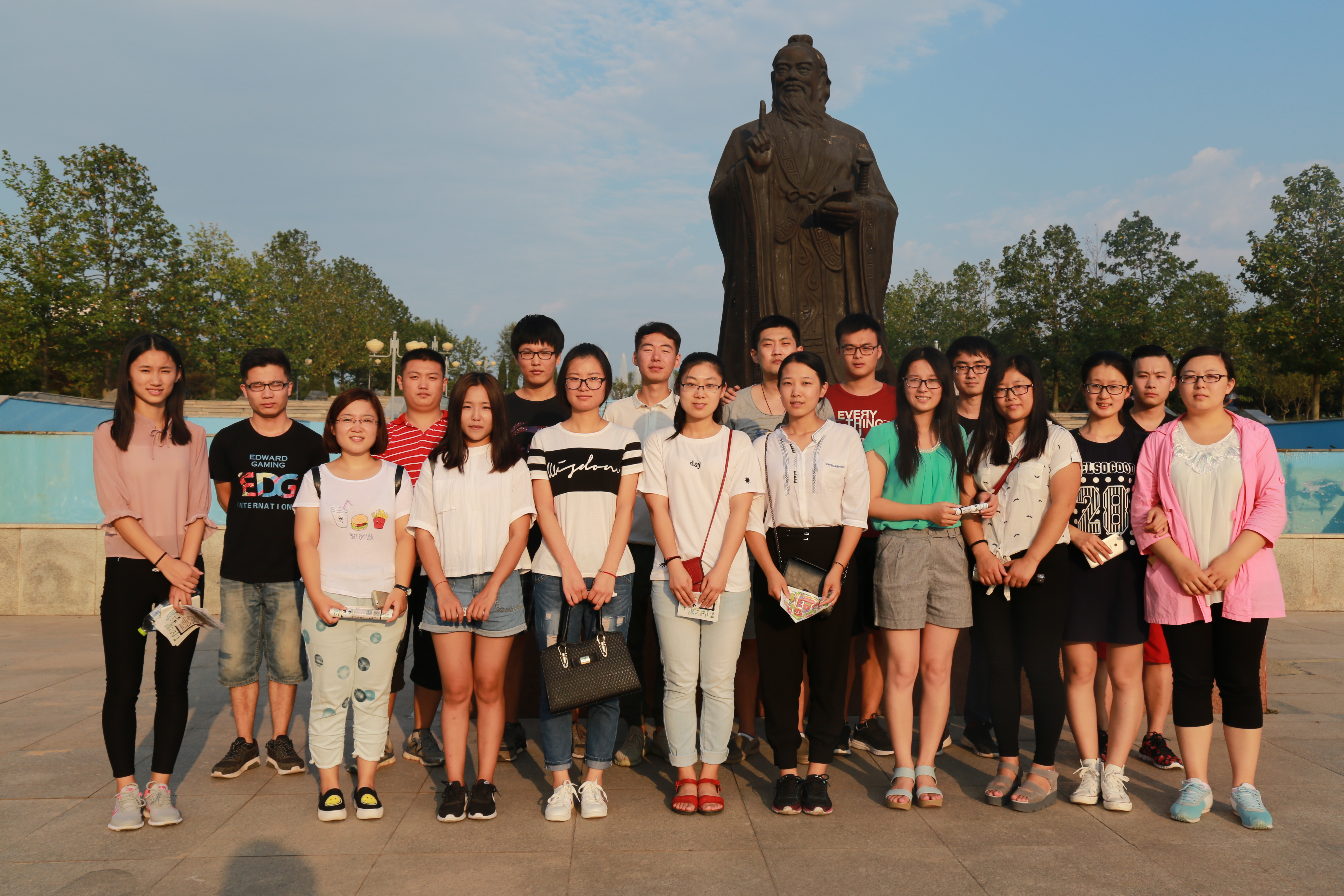 新生在校徽处集合,“曲园行”活动正式开始。参观途中,15级的师哥师姐详细介绍了各教学楼、实验室以及图书馆的使用情况及注意事项,并强调了研究生期间学习仍是第一位,在钻研学术的同时也要保证上课的到勤率。途径东操场,师哥师姐特别提醒新生一定要劳逸结合,多进行体育锻炼。最后,新生在孔子像前合影留念。