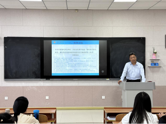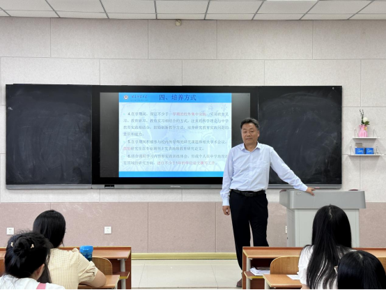 及学科教学(地理)专业的师资力量与办学状况,随后向同学们详细地介绍了人才培养方案的内容,对本专业的培养人才要求、学制及学习年限、培养方式及过程、专业课程设置、专业实践活动、毕业标准及学位要求等方面展开细致解读。