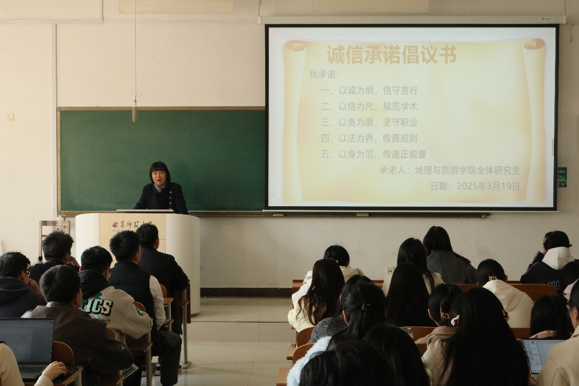 会上,赵岩老师着重强调了诚信的重要性,指出诚信乃立身之本,在研究生的学习与科研生活中发挥着关键作用。会议围绕多个方面展开阐述,强调“人无诚信,寸步难行”,点明诚信是安身立命的根本;指出研究生学术诚信至关重要,并列举相关案例予以警示;明确考试诚信是公平教育的底线,要求学生牢记“不携带、不抄袭、不协助”原则;提醒学生警惕网络诈骗陷阱,遵守网络道德规范;倡导在人际交往中做到真实可靠,树立正确的价值观与道德观;呼吁学生恪守诚信承诺倡议书,秉持诚信正能量。