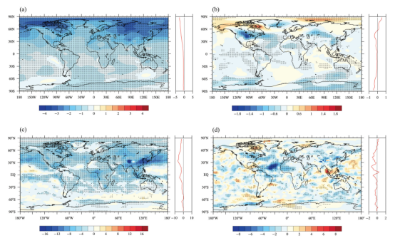 图1 1850-2014年大气中人为PM2.5和人为粗颗粒物(CPM)柱浓度的变化造成的(a, b)地表温度(单位:K)和(c, d)地表净辐射通量(单位:W m-2)的变化。