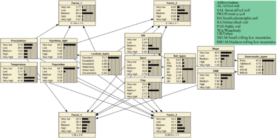 孙小银教授研究组在定量评估山东省南四湖流域11种生态系统服务交互作用的基础上,运用主成分分析法对多重生态系统服务进行降维分析(图1),并采用基于贝叶斯信念网络模型(BBN)识别自然地理和社会经济过程对多重生态系统服务权衡和协同效应的影响机制(图2)。BBN敏感性分析表明,在社会经济因素(土地利用类型、人口密度和夜间光照)、气候因素(降水、温度)、地形因素(数字高程模型、坡度)和土壤特征(土壤类型和土壤质地)中,土地利用对ESs交互作用的影响最为显著。通过BBN情景分析,预测了ESs能力及其相互作用对土地利用、气候和土壤管理的响应,结果表明关键决策可以优化多个ESs。