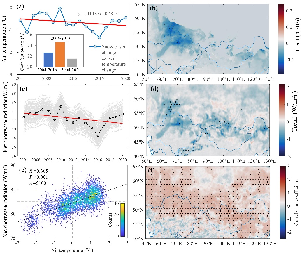 图1 2004-2020年亚欧大陆秋季积雪引起的气温变化及其与积雪引起的净短波辐射变化的关系