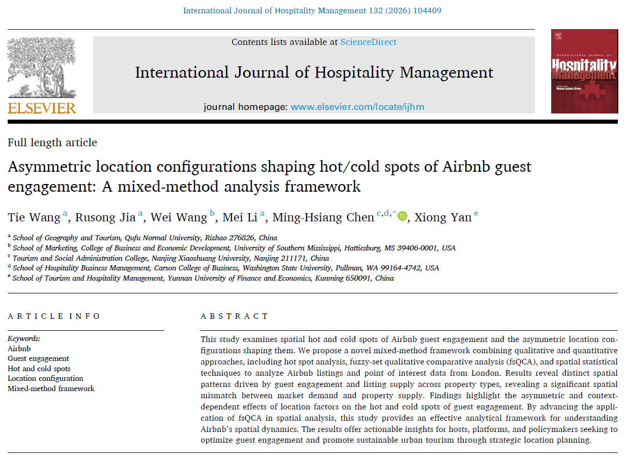 近日,澳洲女足直播 王铁教授团队联合Washington State UniversityUniversity of Southern Mississippi和云南财经大学等国内外高校,在International Journal of Hospitality ManagementIJHM)上发表了题为“Asymmetric location configurations shaping hot/cold spots of Airbnb guest engagement: A mixed-method analysis framework”的研究论文。International Journal of Hospitality Management是全球酒店管理领域顶级学术期刊,五年平均影响因子达到10.3,为JCR一区、中科院管理学一区TOP期刊。曲阜师范大学为该论文的第一署名单位,王铁教授为论文的第一作者,李梅副教授和研究生贾汝松共同参与了论文的研究工作。研究成果得到了国家社会科学基金项目(22BGL156)资助。