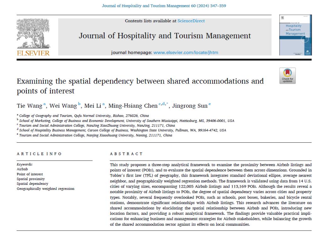 的王铁教授团队与Washington State University和University of Southern Mississippi等高校合作,在国际著名期刊Journal of Hospitality and Tourism Management(SSCI,中科院一区TOP)上发表了题为“Examining the spatial dependency between shared accommodations and points of interest”的研究论文。曲阜师范大学为该论文的第一署名单位,王铁教授为论文的第一作者,李梅副教授作为第三作者参与了论文的研究工作。研究成果得到了国家社会科学基金一般项目(22BGL156)资助。