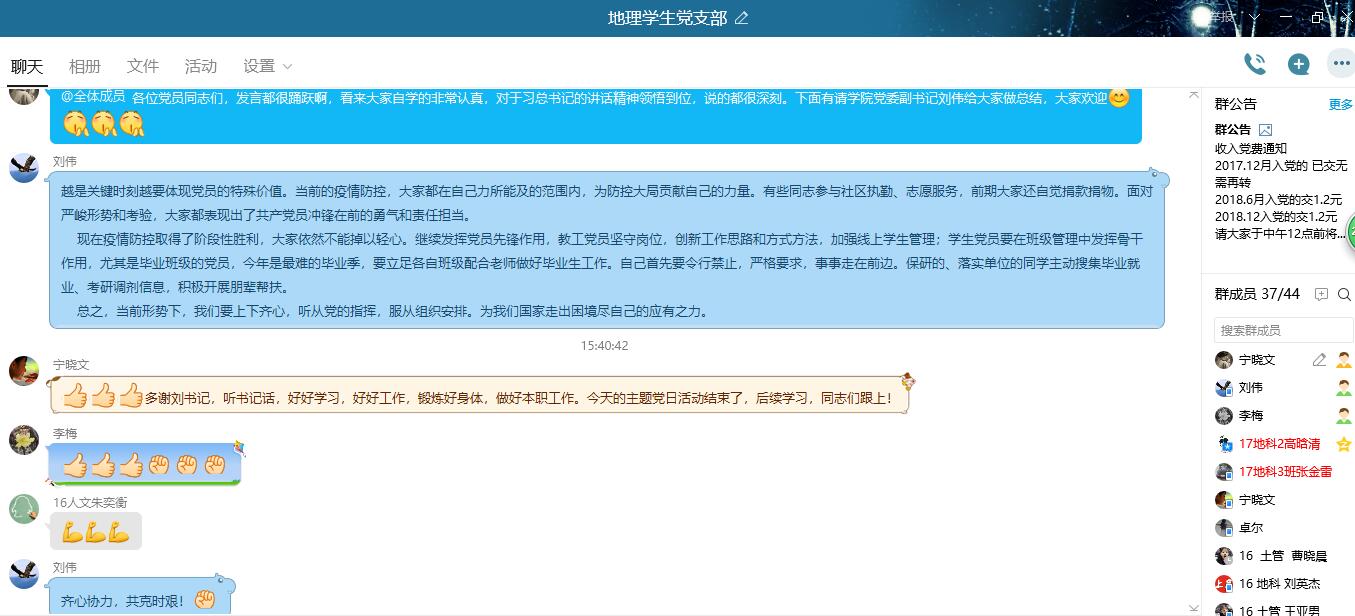 刘伟指出:各党员都在为当前疫情防控贡献出自己力所能及的力量。参与社区执勤、志愿服务、自觉捐款捐物,面对严峻的形势和考验,表现出共产党员冲锋在前的勇气和责任担当。现在疫情防控取得阶段性胜利,但不可掉以轻心。应继续发挥党员先锋作用,令行禁止,严格要求。教工党员坚守岗位,创新工作思路,加强线上管理;学生党员要发挥骨干作用,立足各自班级配合老师完成毕业生工作。全体党员要上下齐心,听从党的指挥,服从组织安排,为国家走出困境尽自己的应有之力。