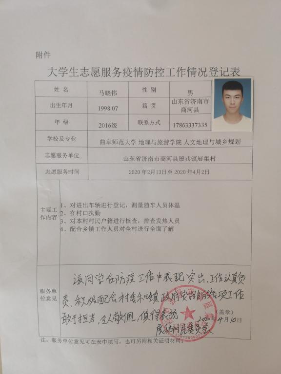 2016级人文地理与城乡规划专业学生马晓伟同学自2月13日以来,在疫情防控期间为社区疫情防控所做的努力。