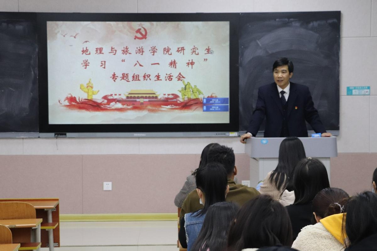 会上,苏占兵带领同学们一同学习了新民主主义革命史、社会主义改革和建设时期历史,重点学习了“追求真理、坚定信念、勇于拼搏、不怕牺牲、敢为人先、开拓创新”的“八一精神”。围绕“八一精神”的基本内涵,苏占兵结合自身重走长征路的经历,给同学们讲解了长征路上红军面临的严峻环境,血战湘江、强渡乌江、飞夺泸定桥、爬雪山、过草地……中国共产党领导下的中国工农红军战胜千难万险,胜利完成举世闻名的二万五千里长征。他指出,进行伟大长征的工农红军,是经过南昌起义、秋收起义等战争的血与火洗礼和淬炼的新型人民军队,具有压倒一切敌人而不被任何敌人所压倒、征服一切困难而不被任何困难所征服的英雄气概和革命精神,希望同学们要学习革命先烈不畏艰难、迎难而上的精神与意志,勇担新时代青年的历史使命,认清形势、找准定位,走好新时代的长征路,为实现中华民族伟大复兴贡献出自己的力量。
