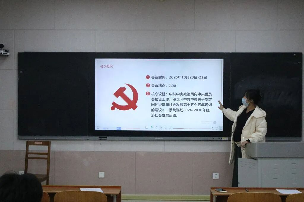 课上,张乃宁从会议概况、核心精神、学生骨干行动方向三个层面,对党的二十届四中全会精神进行系统领学。她强调,“六个坚持”是贯穿全会精神的核心准则,其中坚持党的全面领导是推进中国式现代化的根本保证,全体成员要主动识变、应变、求变,深刻把握全会通过的《中共中央关于制定国民经济和社会发展第十五个五年规划的建议》中“持之以恒推进全面从严治党”的重要要求,为强国建设、民族复兴凝聚青春力量。