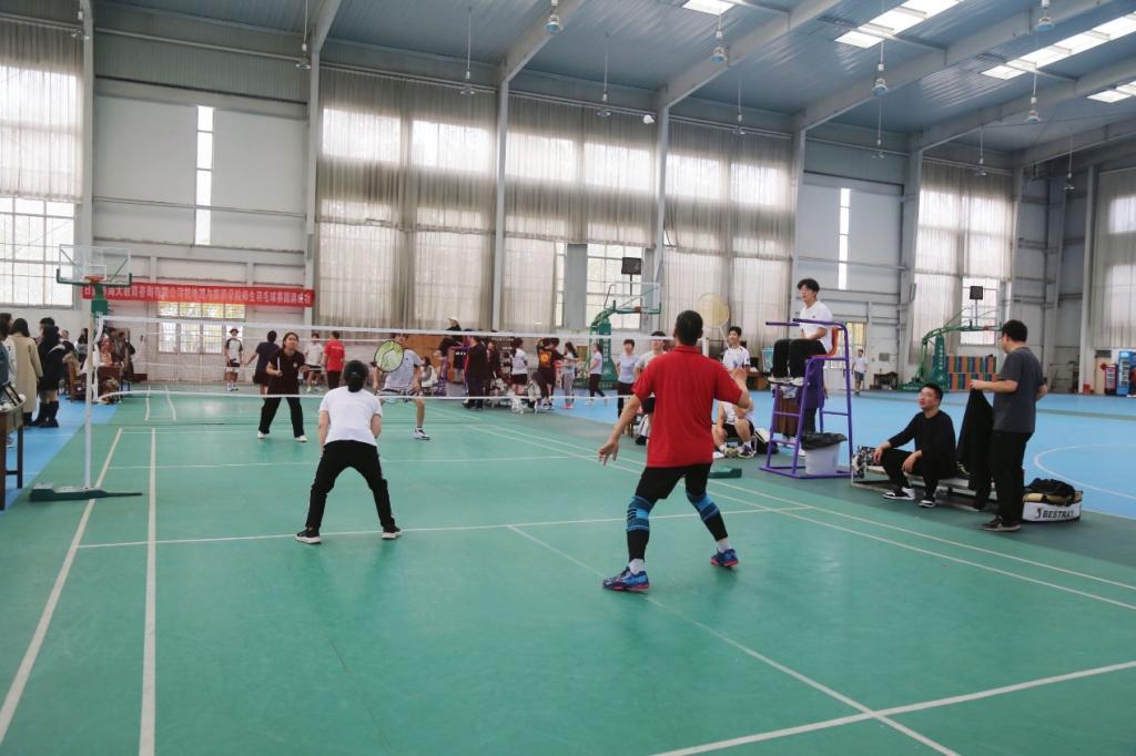 比赛分为小组赛和排名赛两个阶段,比赛项目包括男子双打、女子双打和混合双打三项,每场比赛均采取三局两胜制。赛场上,运动员们个个精神饱满,动作敏捷,精彩的扣杀、巧妙的挑球和精准的落点引发现场观众阵阵掌声。场外,队友们组成的啦啦队也为比赛增添了热烈的气氛,加油声、欢呼声不断,整个体育馆充满了欢乐与激情。