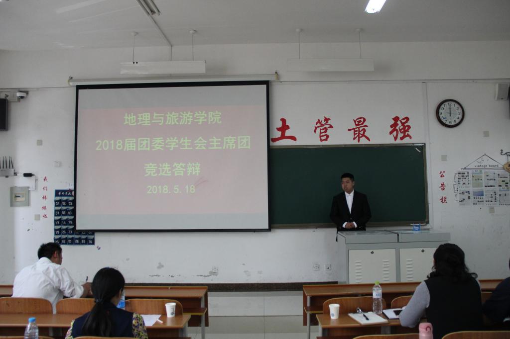 在s楼215教室举行2018届团委学生会主席团竞选答辩。党委副书记刘伟、团委书记宁晓文、2015级辅导员李梅、2016级辅导员陈鑫、2017级辅导员刘翔出席,2017届团委学生会主席团担任评委,22名竞选者参加。