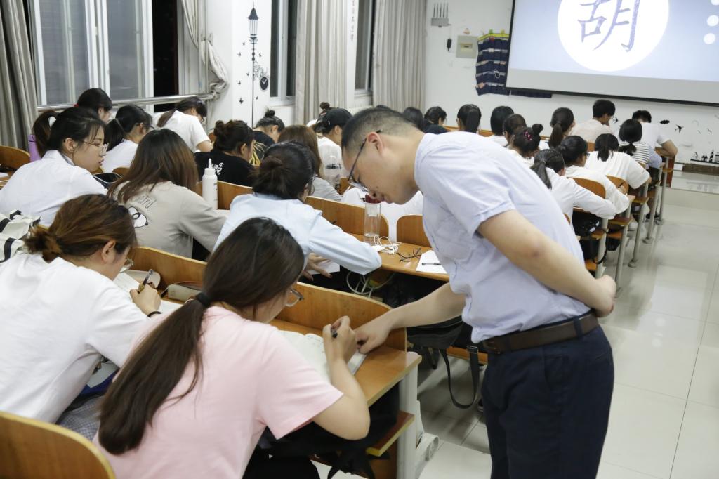 培训会上,王正石老师围绕如何提高书写技能,从书写基础、方法和要求三方面进行了详细讲解。他指出:基本功练习的最佳方法就是临帖,通过学习前人优秀的作品,感知其中所蕴含的书法知识。此外,他还对书写工整、美观字体的技法与技巧以及如何使书法作品内容与形式完美结合进行详细的讲解。讲解过后,王老师对个别同学的作品进行点评与指导并对同学们提出的问题进行逐一解答,其幽默诙谐、通俗易懂的解说赢得了同学们的阵阵掌声。最后,王老师为同学们书写“学无止境”四字,勉励同学们坚持练习,学习中华优秀传统文化,尽快提高从教技能和艺术修养。