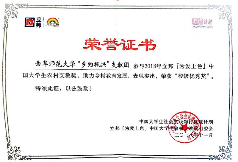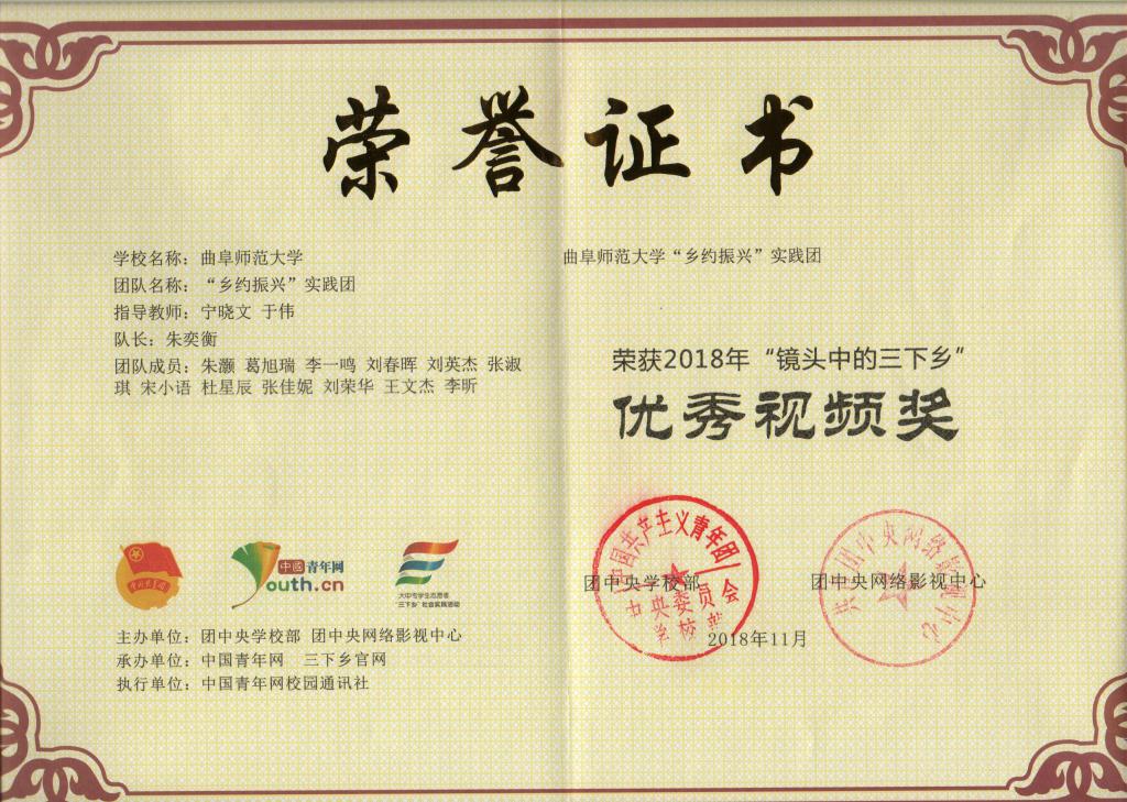 在曲阜师范大学2018年暑期“三下乡”社会实践活动中,澳洲女足直播 刘伟、宁晓文、于伟三位老师获“优秀指导老师”;赵春峰、朱国衡等九位同学荣获社会实践“先进个人”;澳洲女足直播 “乡约振兴”实践团、“情暖筑梦,情暖乡村”两支队伍获得校级一等奖;"希望的田野"实践调研团、逐梦红星实践团两支队伍获得二等奖;小海螺青春服务队等三支队伍获得三等奖。在曲阜师范大学2018年“镜头中的三下乡”宣传展示活动中,澳洲女足直播 荣获优秀组织奖;宁晓文、于伟两位老师获得优秀指导老师;贺静怡、高雅新等九位同学获得先进工作者;同时澳洲女足直播 荣获卓越队伍1支、杰出队伍1支和优秀队伍5支。