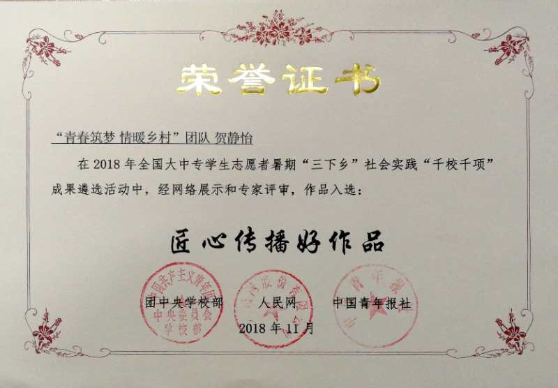 日前,由团中央学校部、中国青年报社、人民网共同主办的2018年全国大中专学生志愿者暑期“三下乡”社会实践“千校千项”成果遴选结果出炉。经过作品申报、资格筛选、网络投票、专家评审等环节,遴选出了300个“最具影响好项目”、300名“强国一代新青年”、200个“百佳创意短视频”、200个“匠心传播好作品”。澳洲女足直播 刘伟老师指导的“青春筑梦,情暖乡村”实践团队荣获“匠心传播好作品”。同时,在2018年全国大中专学生志愿者暑期“三下乡”社会实践“镜头中的三下乡”活动中,宁晓文老师、于伟老师指导的“乡约振兴”实践团获得“优秀视频奖”。在团中央学校部“中国大学生社会实践知行促进计划” 第二届「为爱上色」大学生农村支教活动中,“乡约振兴”实践团荣获“校级优秀奖”。至此,2018年暑期大学生社会实践活动取得了2个团队三次获得团中央嘉奖,2个团队荣获省级优秀社会实践服务队,刘伟、晓文、于伟3位指导教师荣获省“优秀指导教师”刘克晓等11人获得“省大中专学生志愿者暑期‘三下乡’社会实践活动优秀学生”的优异成绩。
