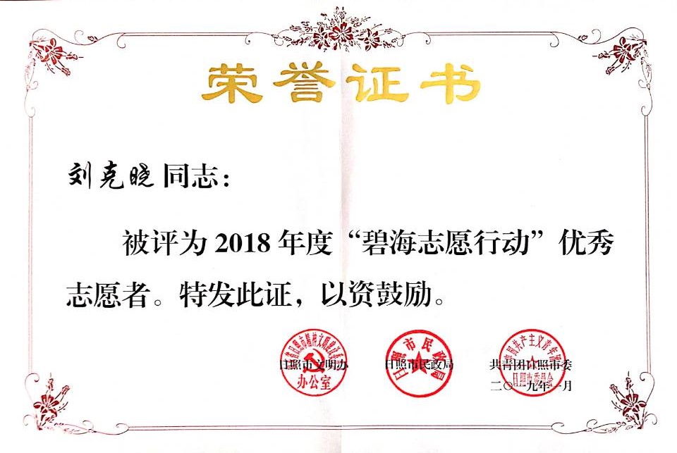 小海螺青春服务队2016级土地资源管理专业刘克晓、2017级地理科学专业荀志远荣获“碧海志愿行动”优秀志愿者。