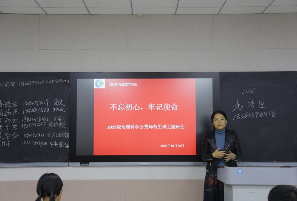 为贯彻落实党的十九大精神,增强学生的使命感与责任感。10月20日,地理科学公费师范生班于S205召开“不忘初心、牢记使命”主题班会。本次会议由我校武装部副部长赵秀臣、班主任谭丽荣出席,2019级辅导员李梅主持,2019级地理科学公费师范生全体成员参加。
