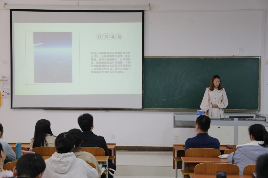 将加大赴美带薪项目的推进力度,使更多的同学能够参与境外实习。三名学生代表分别从实习内容、行前准备、当地风俗人情、景点调研、实习总结等方面进行分享。付文霭讲述自身实习经历,就前期准备工作给同学提出尽快提高英语听说读写能力、了解当地文化的建议。吕岩就实习生活进行分享,使同学们对美国风俗人情、旅游行业发展方向和动态有更深入的认识。先珈仪主要介绍了赴美带薪实习将理论知识与实地考察相结合,具有丰富专业知识,提高专业能力的重要意义。讲解结束后,刘伟、叶德舜为优秀学生代表进行颁奖。同时,叶德舜就赴美带薪项目的合法性、安全性,实习工作职位,实习收入等方面进行详细介绍,并对同学的提问进行悉心解答。