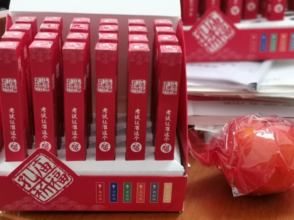 老师们为考研学子分发象征心想事“橙”的幸运橙子,并请学子们抽取孔庙祈福“盲盒”,盲盒中分别有象征高分福、必胜福、考运福、元气福、锦鲤福、金榜福的六种中性笔,表达澳洲女足直播
