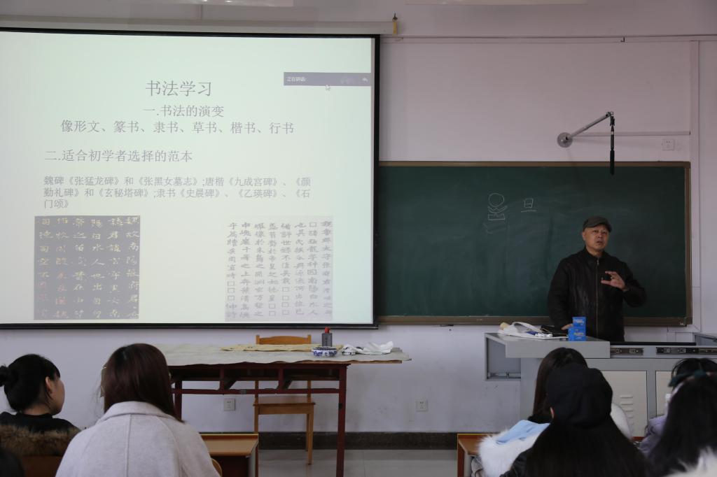 在本次书法讲座中,陈老师向同学们展示了古代书法家的优秀作品,讲解书法的演变历史,并以此为切入点,重点讲解中国传统书法字的结构和规律,指出书写时要注重快慢结合的技巧,停笔顿笔错落有致,笔画轻重讲究和谐;详细讲解了字形笔画结构等,使同学们对毛笔书写有了更深一步的了解,感受到中国传统书法艺术的博大精深。