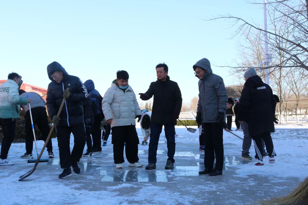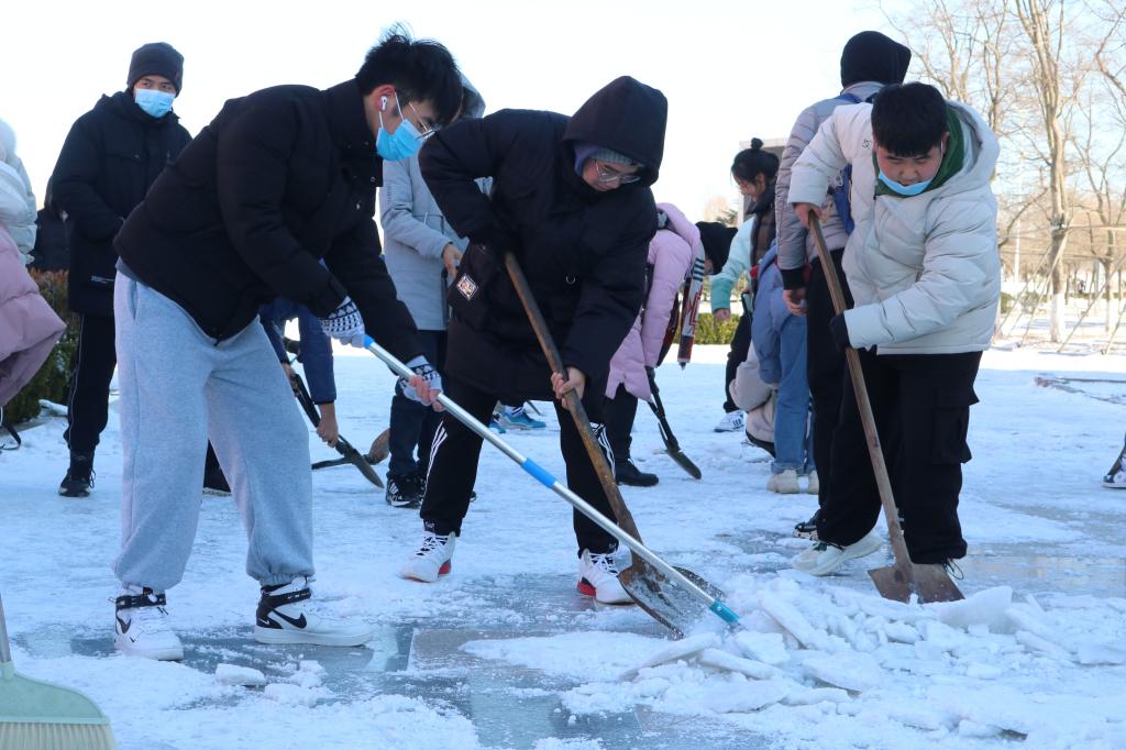 党委副书记刘伟带领辅导员宁晓文、李梅、董青、田青、张乃宁、陈鑫、学生党员、团委学生会干部、入党积极分子于S楼北门前开展清雪除冰行动。