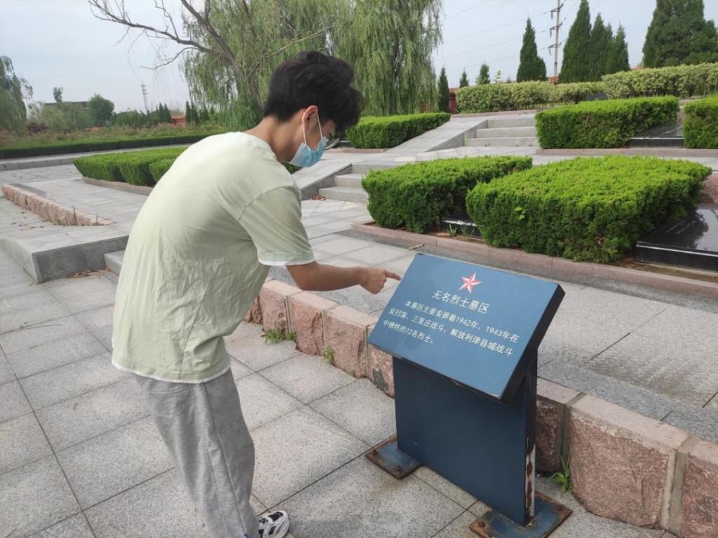纪念塔身后是革命烈士纪念堂。在工作人员的带领下,队员们走进烈士陵园。我们在篆刻有烈士姓名的石碑前驻足。他们都是在抗日战争、解放战争以及抗美援朝战争中牺牲的革命英雄,他们在生命中最美好的年纪选择上战场保家卫国。看着这冰冷的石碑,听着工作人员讲述那段战火纷飞的峥嵘岁月,我不禁发问,面对强敌和死亡他们是否恐惧过?退缩过?我想,他们当年用自己的行动回答了我的问题。直面强敌虽危险,但不愿自己的骨肉至亲再遭受苦难;永坠黑暗虽有憾,但不愿祖国的大好河山再任人践踏!为了自己的家人,为了自己的祖国,数万万像他们一样的中国青年站了出来,奔赴到各个战场,抛头颅,洒热血。他们有着无比坚定的革命信仰,有着无法浇灭的爱国热情。一座座小小的石碑,让我跨越时空,感受到革命英雄无比炽热的革命精神和爱国情怀。
