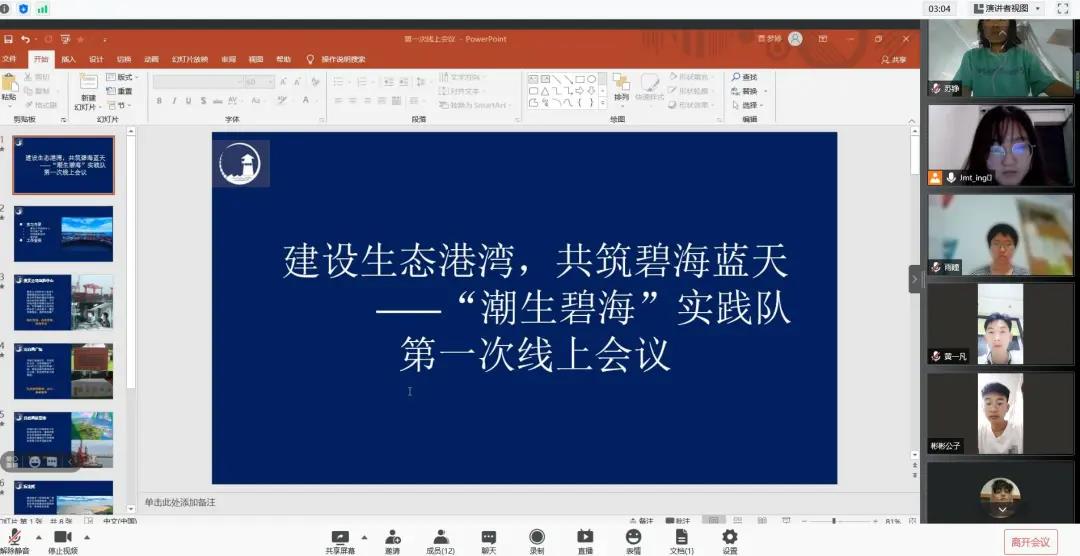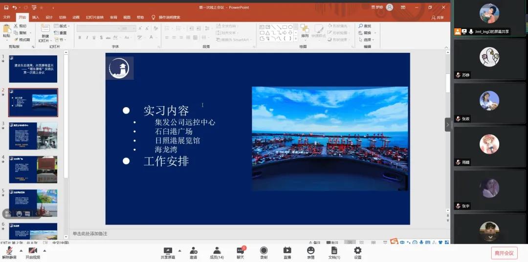 开展“蓝色海湾整治行动”是党的十八届五中全会做出的重大工作部署。为响应绿色发展号召,深入了解日照港发展现状和绿色转型进程,曲阜师范大学“潮生碧海”实践队走进日照市日照港,展开实地调研。2021年7月20日,“潮生碧海”实践队举行首次线上会议,介绍实地调研详细内容,安排实践后期各项工作。本次线上会议由实践队长贾梦婷主讲,实践队员全员参加。