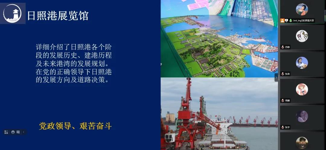 本次线上会议主要分为两大模块:介绍实践内容和安排后续工作。队长贾梦婷首先向大家介绍了日照港的大致情况,并从多个方面详细介绍了集发公司远控中心、石臼港广场、日照港展览馆和海龙湾四个实践地点的调研情况和各自的发展方向。围绕“国情观察”这一主题,本次实践活动主要着眼于日照港的产业发展现状和生态转型项目进程。