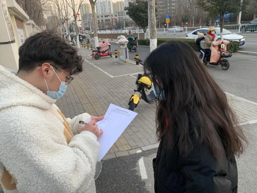 图为队员在放学路上对家长开展问卷调查