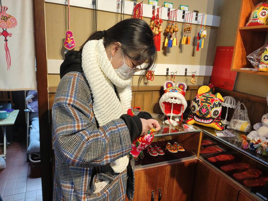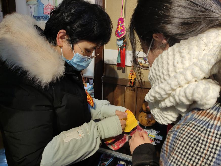队员们首先来到了日照割花技艺传承人徐俪平师傅的店铺,映入眼帘的是各式各样的布制工艺品,除外表精致外,它们还有着独特的寓意,像平安锁象征着祛灾,保护娃娃的平安;布马象征着马到成功;小小的布制老虎头手链也承接着虎年的新气象。我们几个实践队队员对这些精致的手工艺品产生了浓厚的兴趣,轻轻拿起,布料柔和的触感在指尖摩擦,细细抚摸,紧实的针线又让我们不禁感慨手艺人的巧劲。看着针线和珠子在徐师傅的手上翻转变换,短短一会就变成了一条俏皮可爱的手链,我们也按耐不住尝试了一下,终于在徐师傅的指导下完成了一个小小的布老虎。割花看起来简单,实际尝试起来却要复杂的多,比起技艺来说,更难的是耐心的考验,制作一只精致的大布老虎需要三个月,而中小型的也至少要十几天,要沉下心去一丝不苟的对待每一针每一线,在当今繁杂的社会中,也显得尤为宝贵。有不少记者、自媒体来采访过徐师傅,徐师傅也亲自走入中小学的校园,手把手的向学生们教授相关的技巧。每年都有人慕名前来学习,但大多都是三分钟热度,待热情劲过了,也就放弃了学习割花这一门手艺,这也是现在非遗传承人稀缺的现状的原因之一。