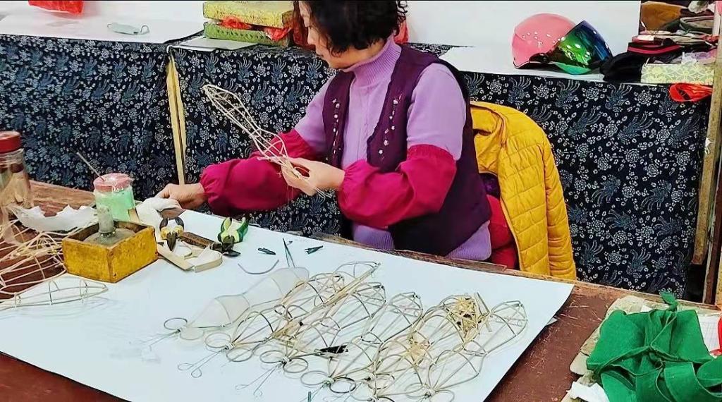 最后实践队员参观风筝制作作坊。在这里,他们观看了风筝制作的一系列流程。首先将竹条削成需要的大小,搭建出轮廓并用线及胶水固定好,然后选取一张适合的纸,并在上面绘画,再将用胶水把骨架和纸粘在一起,把多余的纸沿骨架裁剪掉,将线的一头绑在风筝的中上部。如此,便制作完成了。“杨美洁”作为这项非物质文化遗产的传承人,她受到长辈的熏陶,从小开始制作潍坊风筝,对家乡的古老艺术有着浓厚的感情,杨师傅热心的为队员们展示了风筝的制作工艺,潍坊风筝的独特个性通过“扎、绘、糊、放”的四艺来体现,队员们便把它拍摄记录下来,希望我们的探查任务能切实帮助家乡的风筝做好宣传。