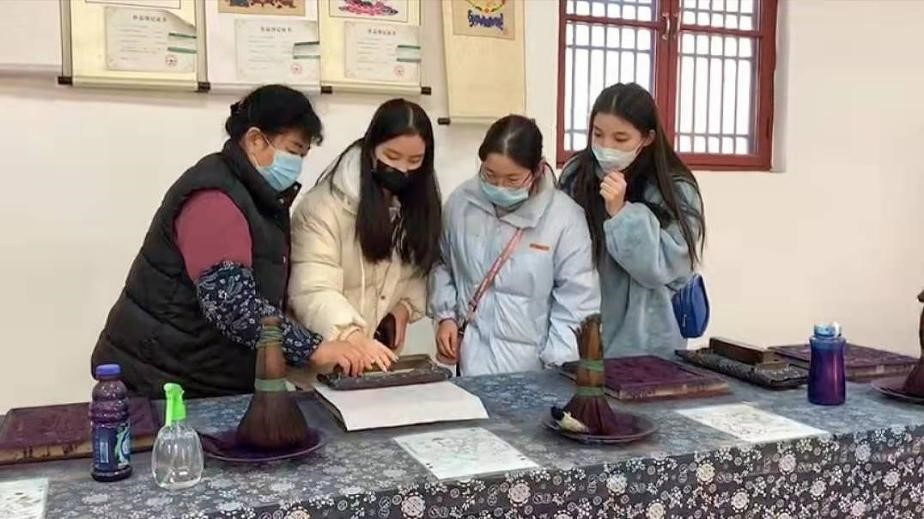随后,实践队员来到年画制作作坊。在年画师傅的指导下,队员们学习了印画这一手艺。在梨木板上用棕刷均匀上色,将纸铺在梨木板上,用擦子将画板上的墨线印到纸上,最后将纸上的墨晾干,一幅年画就完成了。这看似简单,实则不易。需要师傅将墨线和套色版准备齐全,将数百张白纸固定在刷印图案的位置上,再将画版仰放在纸的左边,将纸覆在涂匀颜料的画版上,再用棕刷平刷画版上的纸。如此刷完,再换另一颜色版,依样刷印,直到全部画版刷完。在此期间要控制木板与年画的精确位置,防止颜色印画到其他区域。