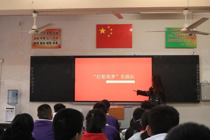 接着,我们来到班级团支部进行团史教育宣讲活动,带领一中学子们感悟百年团史发展历程。在为孩子们讲解的过程中,我们能够真切感悟到孩子们对团史发展的惊叹与崇敬。百年来,作为中国共产党的青年组织和青年群体的政治组织,共青团始终坚持用马克思主义武装青年,用远大理想感召青年,用精神力量凝聚青年,谱写了团结、教育、凝聚青年为实现党的奋斗目标,为国家繁荣,为民族复兴而不懈奋斗的宏伟篇章。广大青年紧跟中国共青团的步伐,积极向党,为祖国发荣发展而不懈奋斗。“红船筑梦”实践队期望动员广大青年把报国之志转化为实际行动,努力成为担当民族复兴大任的时代新人。要求广大青年“要坚定理想信念、练就过硬本领、勇于创新创造、矢志艰苦奋斗、锤炼高尚品格,在弘扬和践行社会主义核心价值观中勤学、修德、明辨、笃实,爱国、励志、求真、力行,用一生来践行跟党走的理追追求。