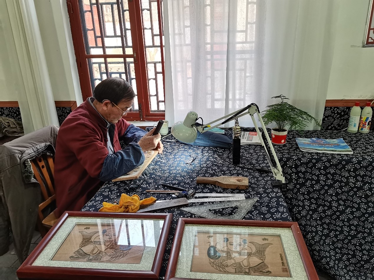 在拜别风筝扎制作坊的师傅们后,寻迹小队又来到了木板年画作坊。与风筝扎制作坊不同的是,木板年画作坊分为两部分——雕刻作坊和印制作坊。寻迹小队来到木版年画雕刻作坊。在这里,我们遇到了杨家埠木板年画第二十二代传承人杨颖伟师傅、杨凯凯师傅和潍坊民间文化杰出传承人颜克臣师傅。交谈中我们问杨师傅为什么会选择从事木版年画的传承工作,他告诉我们,从小受祖辈们传统艺术的熏陶,耳濡目染之下对年画艺术产生了浓厚的兴趣,从而走上了本板雕刻之路。因为对雕版制作有着独特的灵性和理解,他有幸成为了木版年画传承者。同时他还告诉我们:现在这种传统工艺很少有年轻人想要学习,他希望通过我们的宣传能够有更多的年轻人了解、喜欢、热爱木板年画,并能加入到木板年画的学习、传承中来,给木版年画增添新的活力。