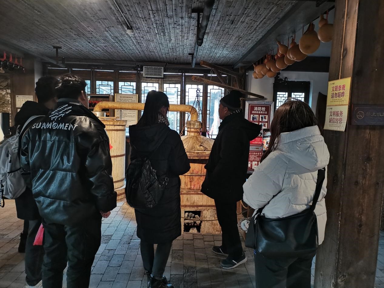 在运河酒文化馆,实践队详细了解制酒工艺。中国被称为酒的故乡,酒文化源远流长。运河古城台儿庄作为南北文化交汇区和海陆文化过渡带,酿酒历史悠久,酒文化内涵丰富。在调研过程中,实践队员们深度了解了酿酒工艺。酿酒师傅介绍,酒是各种酿酒的粮食,拌在一起,粉碎以后,拌上酒糟,拌上稻壳,再放在甑锅里蒸。之后放凉,再加酒曲和水拌匀,放到发酵池里,泥上发酵泥,盖上塑料布,然后自然发酵。师傅还介绍到,发酵45天的酒叫大曲,发酵95天的叫特曲,发酵135天的叫老窖。发酵时间的长短决定了酒的质量,发酵时间越长,酒越好喝,但是出酒率低,成本高,价格贵。发酵之后就形成了酒醅,此时的酒醅是固体形态,需提炼出来再次放到甑锅里,用蒸汽蒸,通过循环冷却,便得到了酒。师傅说接酒时他可以通过酒花的大小和酒花灭的快慢判断酒的浓度:酒花越大,灭的越慢,浓度越高,反之则浓度越低。酿完的酒必须窖藏两年以上,否则会有很浓的辛辣味且不醇和。真是没想到小小一瓶酒工艺竟如此复杂,制作周期如此之久。