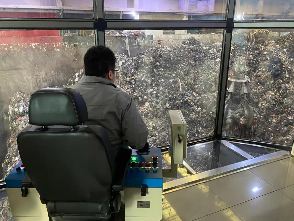 图为工作人员操控机械爪进行垃圾运输