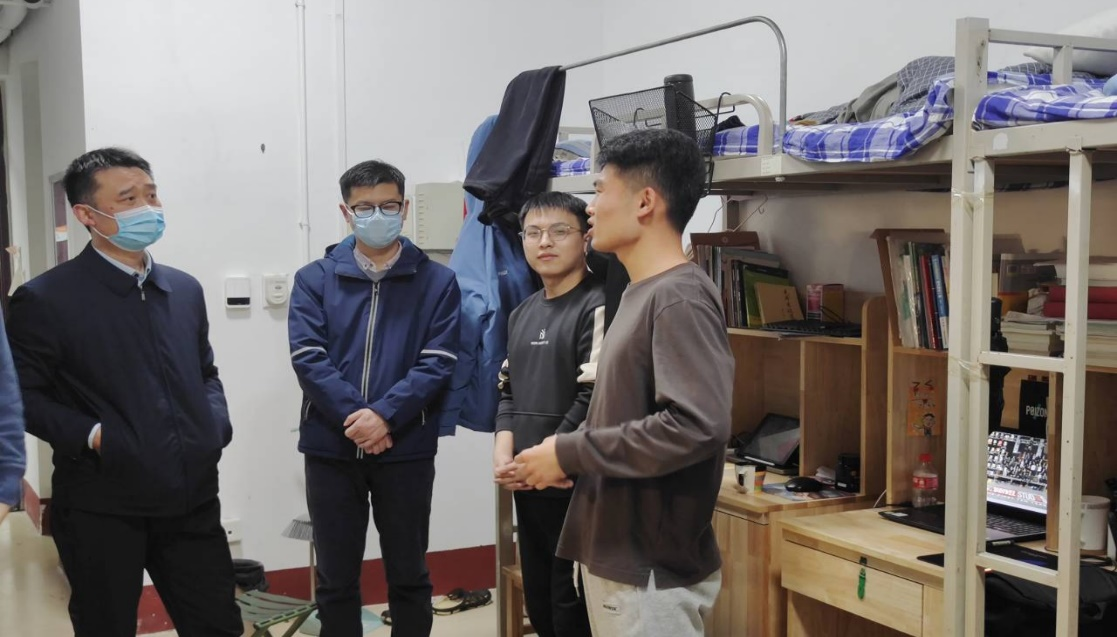 走访中,老师详细查看了同学们的宿舍状况,用水用电、消防安全等;询问了大家考研、就业状况,并就大学学习、考研复试、调剂以及就业问题与同学们深入讨论。刘伟指出,宿舍是大家共同的家,也是赋予大家安全感的地方,每个人都有责任去爱护它、保护它。良好的宿舍生活环境使人心情愉悦,有利于在校大学生的生活及心理健康。他鼓励大家要积极主动,认真复习,多方联系,在做好日常学习和复习的基础上,全力冲刺,做好复试和调剂工作。他强调,当前本土新冠病例激增,疫情防控处于紧要关头,作为当代大学生要有责任心,尽自己所能为社会做出贡献,做到出门戴口罩,勤洗手、不扎堆、不聚集,严格遵守学校各项防疫规定,坚持非必要不外出,坚持生活区-教学区“两点一线”;同时要加强锻炼,对疫情防控保持乐观,保持身心健康。