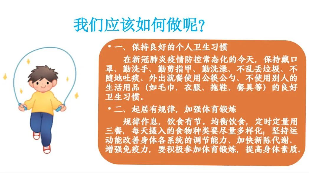 一、保持良好的个人卫生习惯。在新冠肺炎疫情防控常态化的今天,保持戴口罩、勤洗手、勤剪指甲、勤洗澡、不乱丢垃圾、不随地吐痰、外出就餐使用公筷公勺、不使用别人的生活用品(如毛巾、衣服、拖鞋、餐具等)的良好卫生习惯。