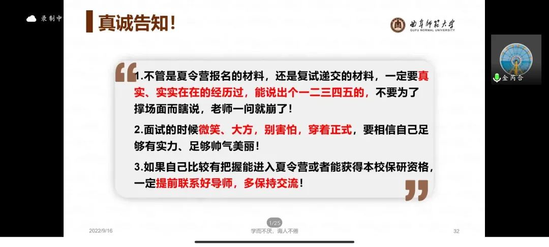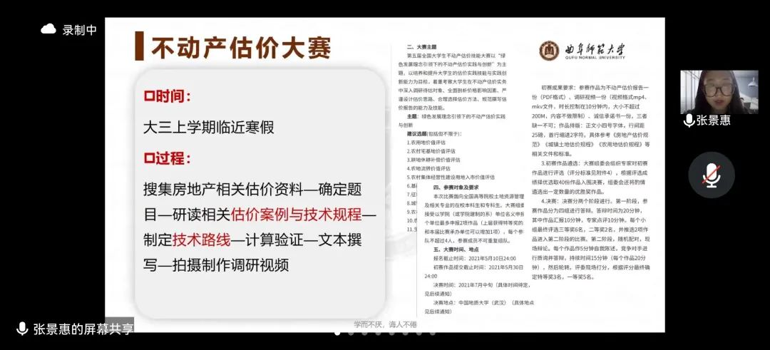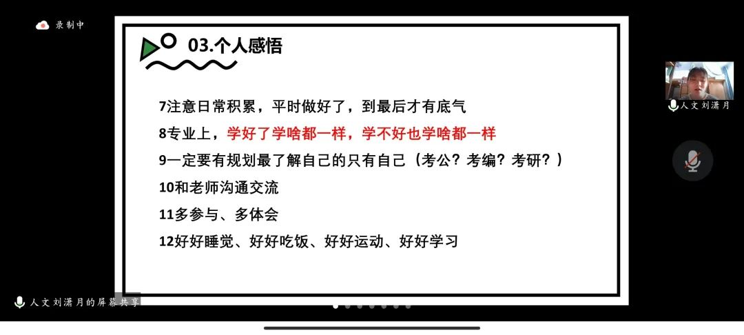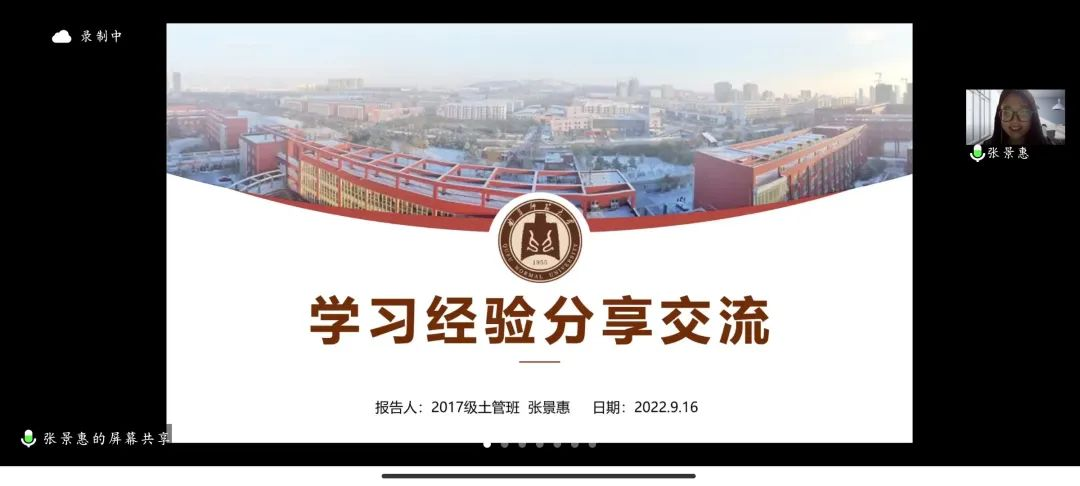 2017级保研到南京农业大学的土地资源管理专业张景惠指出,大学不仅是学习专业知识的殿堂,更是学习为人处世,锻炼情商的平台;同时态度、逻辑、规划、创新也是必不可少的四要素;应结合自身实际,清晰个人定位。2017级土地资源管理专业考研到东北师范大学的刘潇月细致分享个人感悟,建议同学们敢于尝试,敢于行动,多参与、多体会,注重日常积累,具有个人计划,坚持学以致用,践行知行合一。