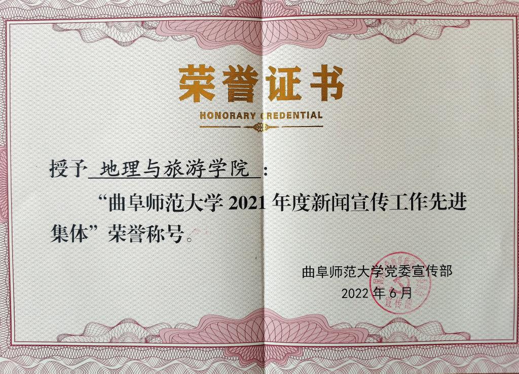 紧紧围绕中心工作做好新闻宣传,完善工作机制、强化师生融合、推动文化引领、弘扬地院之蕴,获评“曲阜师范大学2021年度新闻宣传工作先进集体”和“曲阜师范大学2021年度新闻宣传工作先进个人”。