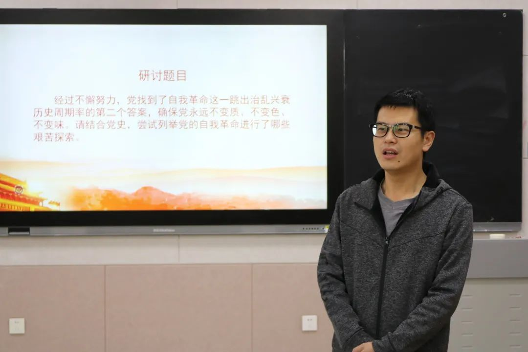 研讨第一部分,感悟党的自我革命所进行的艰苦探索。入党积极分子代表学习和介绍了建党以来的多次具有里程碑意义的自我革命,说明党的自我革命的重要意义。他们说到,勇于自我革命是中国共产党区别于其他政党的显著标志,自我革命精神是党永葆青春活力的强大支撑,身为时代青年,要加强对党史和时事的学习,树立自省意识,坚持守正创新,坚持自我革命,筑牢信仰之基,补足精神之钙。