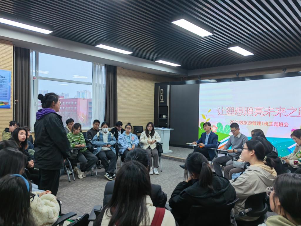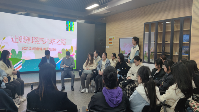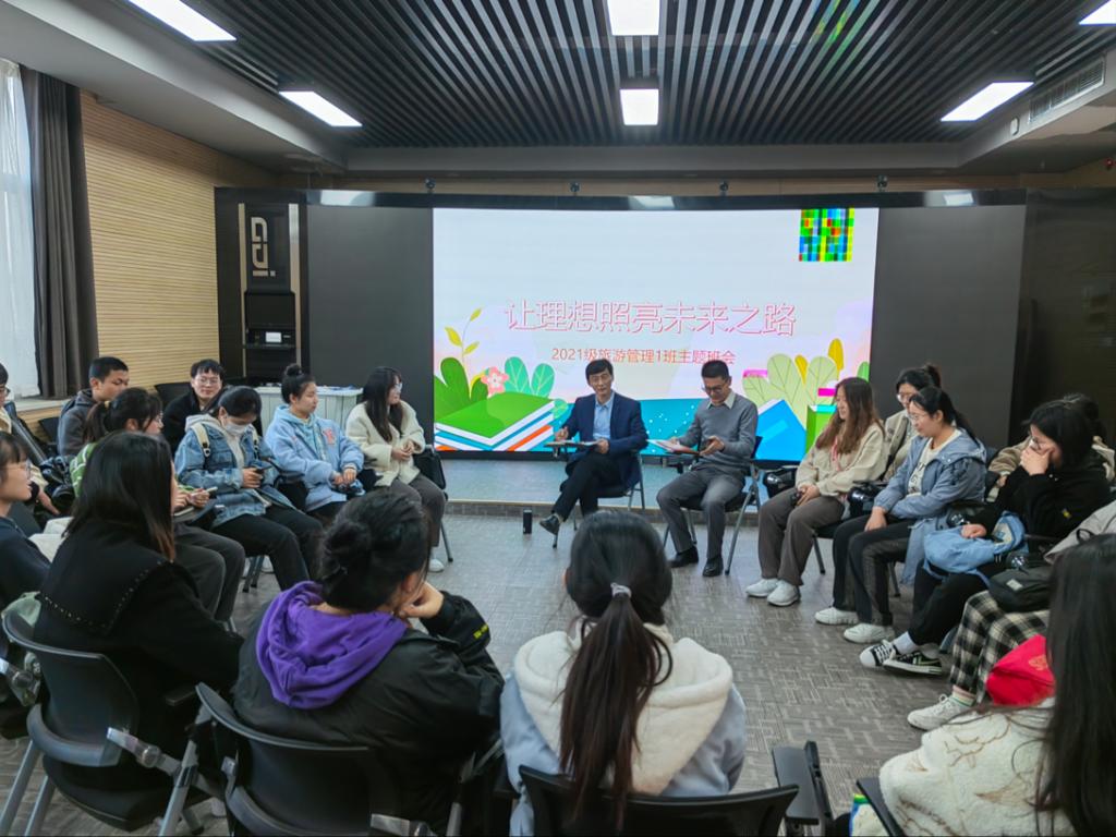 副院长吴军来到联系班级2021级旅游管理1班,参加“让理想照亮未来之路”主题班会,与同学们亲切交流座谈。班会由辅导员田青主持。